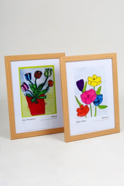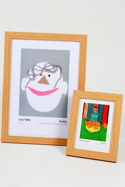 A surround that has the pupil’s name and year on the left side, school logo in the middle and title of the picture, plus date of the exhibition.